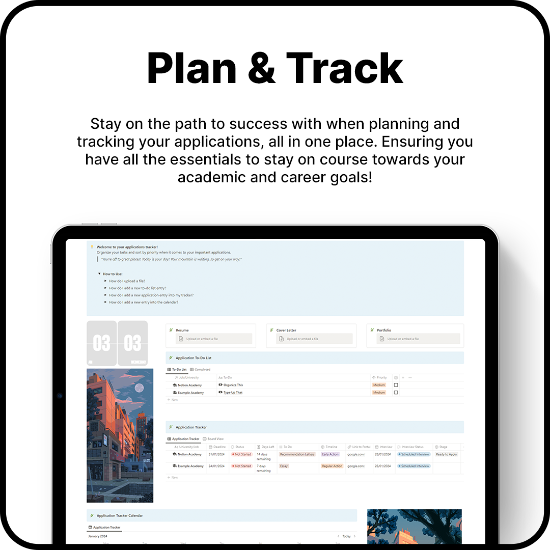 Navigate the path to your dream university or job effortlessly with our applications tracker. Whether you're nervous or excited, the best path to take is to plan and prepare. This user-friendly template helps you organize your tasks needed for applying, track your applications in detail and holds all your necessary tools like your resume and/or portfolio. All your essentials located all in one place!