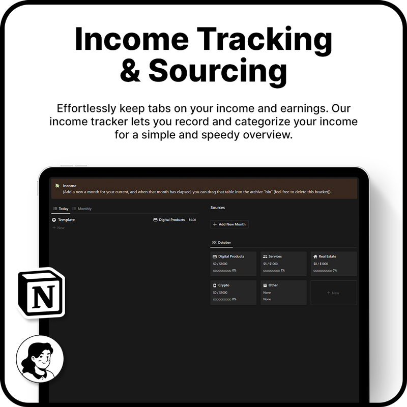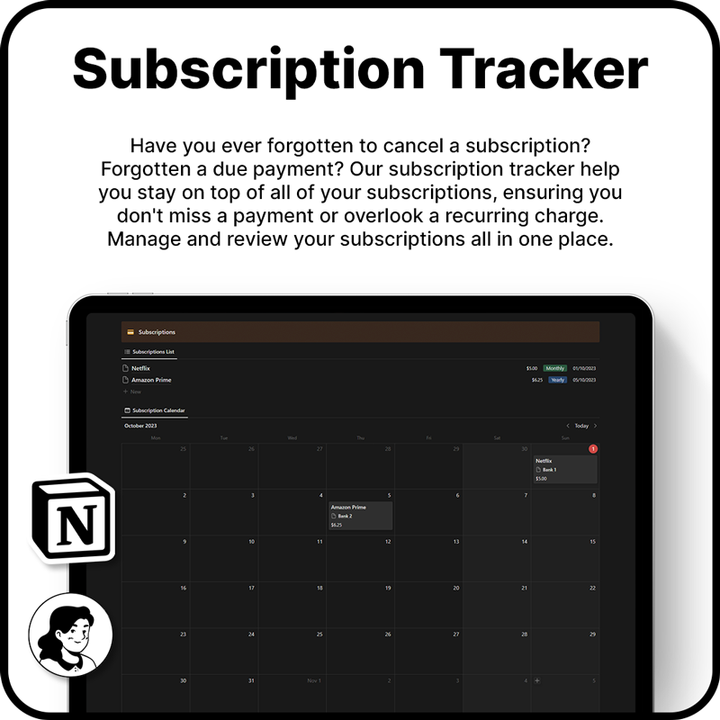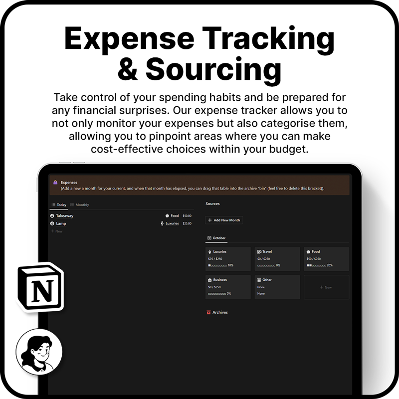 The template conveniently allows you to monitor your income, expenses, and subscriptions – organising your sources of income, categorising your expenses and your monthly subscriptions. Without forgetting to mention, you’re able to monitor goals if you’re working on saving up.
