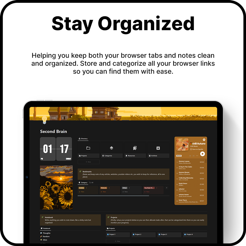 Your digital sanctuary for enhanced organization and knowledge management. This thoughtfully designed template is is like your own virtual assistant, it helps you seamlessly store and retrieve ideas, notes, projects, and more, turning chaos into clarity and sparking creativity.