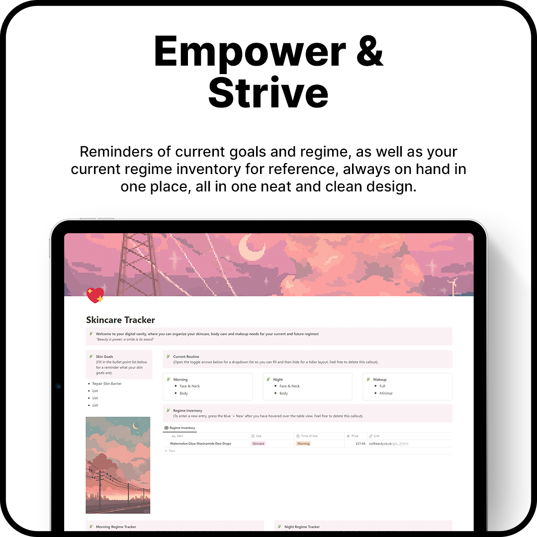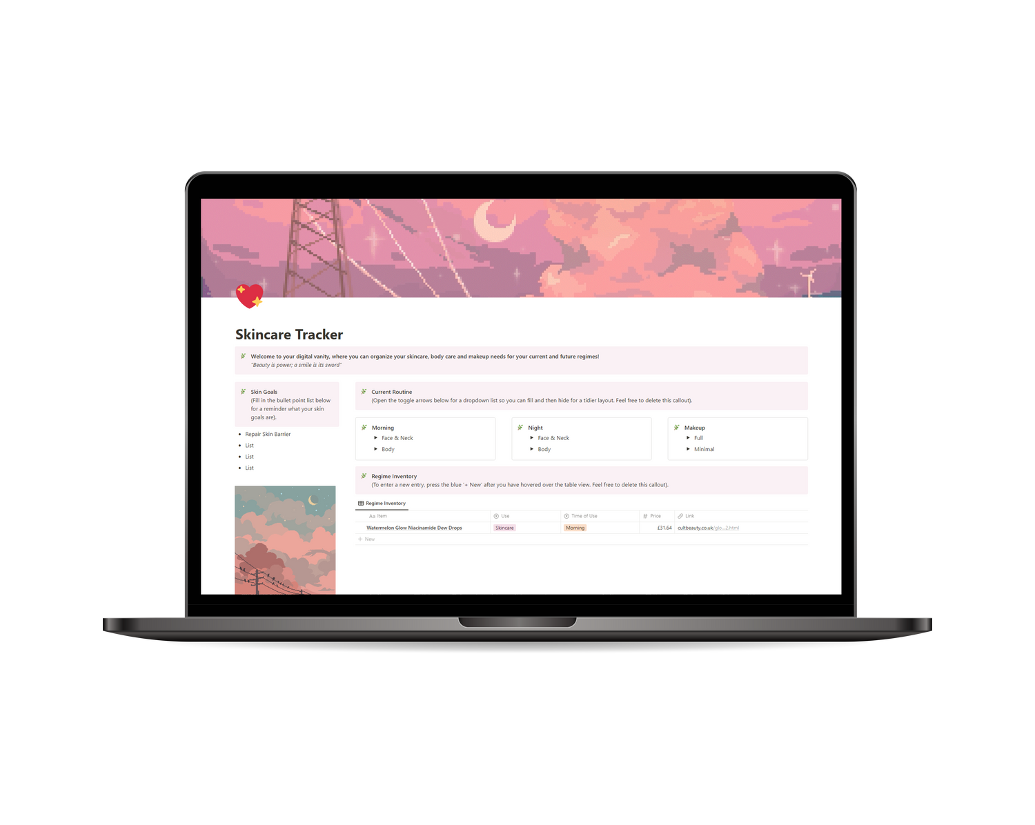 Introducing the Notion Skincare Tracker – your key to organized and tracked skincare routines on a daily basis. From cleansers to serums, stay on top of your routine, ensuring a personalized and effective approach to achieving your skincare goals.