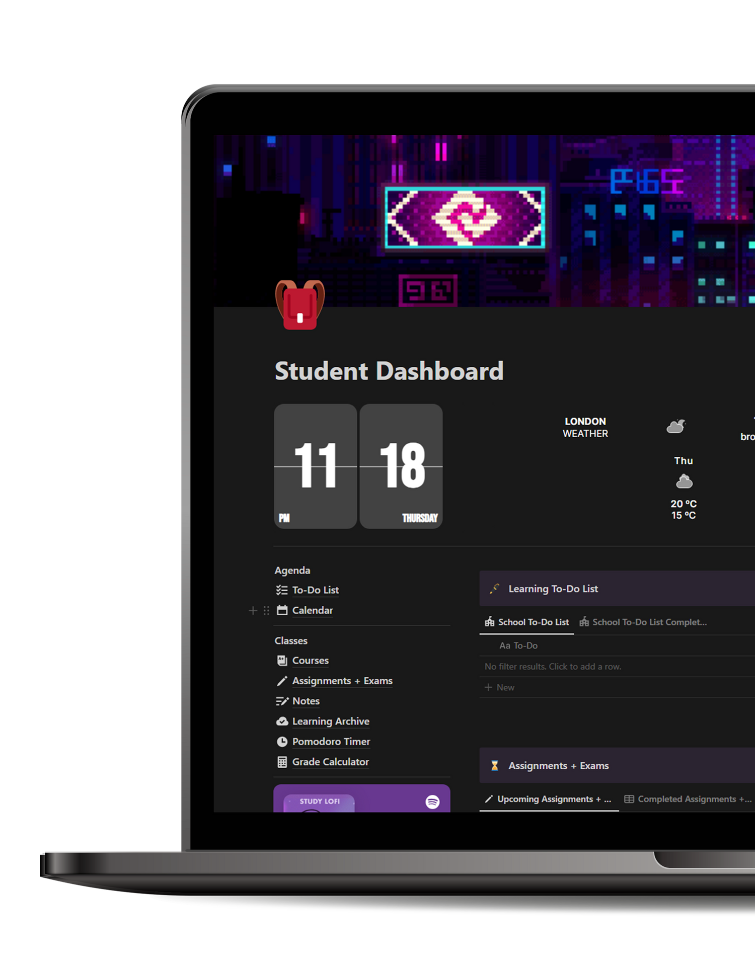 No one said school life had to be stressful. An all-inclusive student dashboard crafted just for you. As a graduate from university, it has been meticulously designed to support and cater many aspects to assist you with your academic journey. Helping you to efficiently keep on top of school using calendars, schedules and to-do lists.